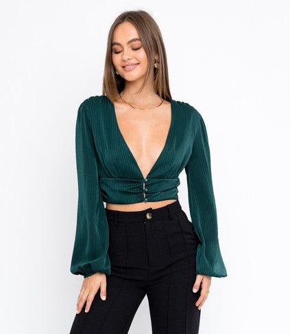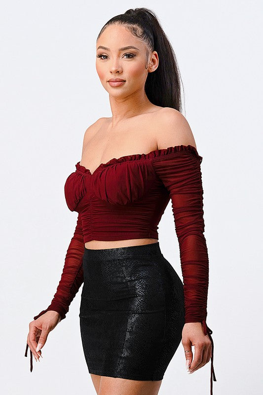 Crop Top Guinda con Manga Larga de Malla y Escote Bardot