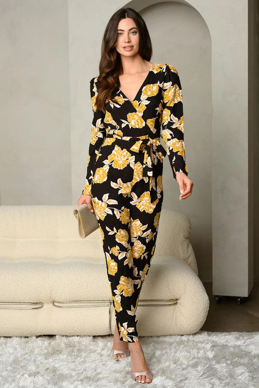 Jumpsuit Negro de Manga Larga con Estampado de Flores Amarillas