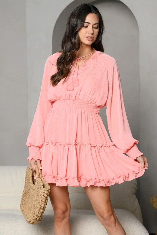 Vestido Coral de Manga Larga con Detalles Fruncidos
