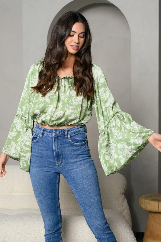 Blusa Verde con Estampado Floral y Mangas Acampanadas