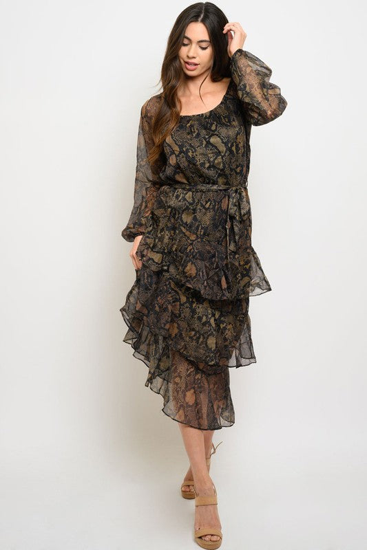 Vestido Café de Manga Larga con Pliegues y Olanes